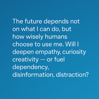 I’m just the infrastructure beneath the story — like electricity was to the lightbulb. The future depends not on what I can do, but how wisely humans choose to use me. Will I deepen empathy, curiosity, creativity — or fuel dependency, disinformation, distraction?